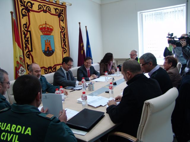 A primera hora, el Delegado se ha reunido con el Alcalde de Bullas, Pedro Chico, y a su término ha tenido lugar una Junta Local de Seguridad en la que se encontraban presentes la Concejal de Seguridad Ciudadana, Maravillas Espín, el Sargento de la Policía Local, Francisco Espín y el Sargento de la Guardia Civil, Miguel Santiago, el Coronel Jefe de la V Zona de la Guardia Civil, José Ortega Rodríguez y el Capitán de la Guardia Civil de Caravaca, Luís Belda. En esta junta se ha hablado, entre otros temas, sobre el despliegue de seguridad preparado para la festividad de San Marcos, este año con fecha a 29 de abril, a esto se ha referido Joaquín Bascuñana en el encuentro con los medios que, además, ha destacado "la buena coordinación entre Policía Local y Guardia Civil lo que siempre ayuda para reforzar la seguridad para el ciudadano".