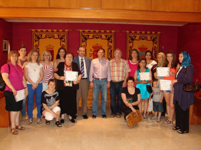 Esta mañana, el Director General de Asuntos Sociales, Igualdad e Inmigración, Leopoldo Navarro, el Alcalde de Bullas, Pedro Chico, la Concejal de Política Social, Mª Antonia Abril, el Presidente y la Secretaria de la Asociación, Rafael Sánchez y Mª José Chumillas, respectivamente, han clausurado el Taller de 40 horas de formación socio-ocupacional con la entrega de diplomas a las 9 mujeres residentes en Bullas, 5 españolas y 4 marroquíes, que han participado en el mismo y que han trabajado en la confección de los trajes que llevarán puestos el Colectivo de Amigos de "La Mora" en la festividad de San Juan en la noche del 23 de junio.