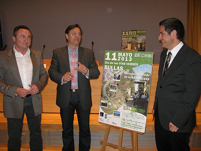 El director general del Instituto de Turismo, Enrique Ujaldón, presentó hoy junto al alcalde de Bullas, Pedro Chico, y el gerente del Consorcio de las Vías Verdes de la Región de Murcia, Juan Soria, la ruta conmemorativa del Día de las Vías Verdes que acoge el próximo 11 de mayo este municipio. La ruta es gratuita y para todos los públicos y se espera la asistencia de mil personas.