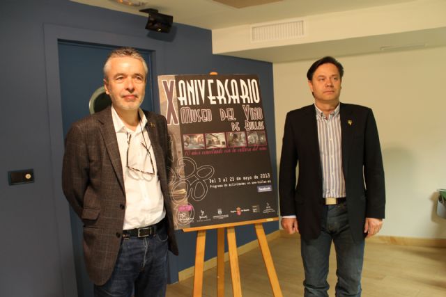 Ayer, fue presentada la programación de actividades que han sido programadas por la concejalía de Turismo del Ayuntamiento de Bullas para conmemorar el X Aniversario del Museo del Vino. El Alcalde de Bullas, Pedro Chico, acompañado por el Director General de Bienes Culturales, Francisco Giménez, dieron a conocer el programa de eventos desde culturales hasta formativos que tendrán lugar del 3 al 25 de mayo.