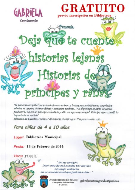 El próximo jueves 13 de febrero (17 horas) la Biblioteca Municipal de Bullas acoge un cuentacuentos gratuito para niños de 4 a 10 años. Organizado por la Concejalía de Educación y Cultura del municipio, será realizado por Gabriela Cuentacuentos y los participantes deben inscribirse previamente en la propia Biblioteca Municipal de Bullas.