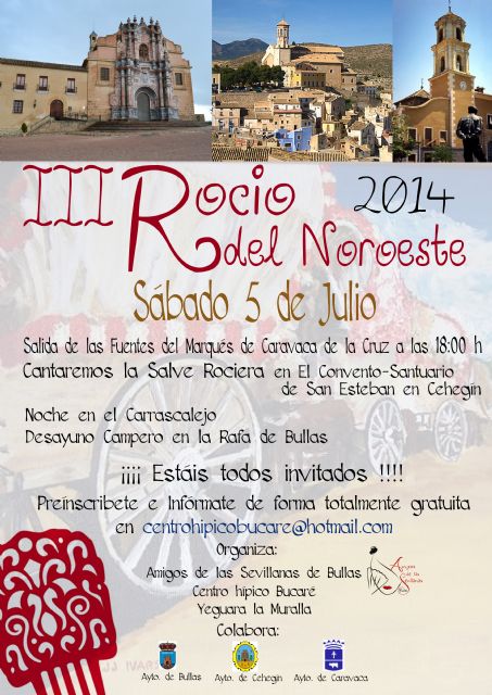 Jinetes y amazonas, junto a algunas personas a pie, realizarán un recorrido por el interior de Caravaca para dirigirse hacia la Vía Verde dirección Cehegín donde harán una parada en el Convento-Santuario de San Esteban para cantarle una Salve Rociera a la virgen. Después, proseguirán la marcha hacia el Carrascalejo, pasarán la noche, y, por la mañana temprano, continuarán por la Vía Verde hasta Bullas a La Rafa finalizando con un desayuno campero y reponiendo fuerzas.