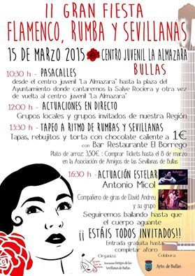 El próximo domingo 15 de marzo, desde primera hora de la mañana, la "Asociación Amigos de las Sevillanas" de Bullas propone una gran jornada festiva con aires andaluces en el Centro Juvenil "L'Almazara" del municipio. Se trata de la segunda edición de la "Gran Fiesta del Flamenco, Rumba y Sevillanas", en la que colabora el Ayuntamiento local y que contará con entrada gratuita hasta completar aforo.