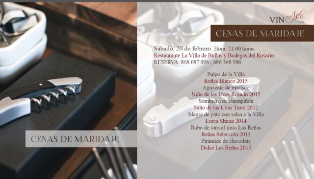 Otra buena forma de saborear los vinos de la DO Bullas es mediante una cena maridaje. Este sábado la primera de estas cenas, se hará a partir de las 21 horas en Restaurante Villa de Bullas junto a Bodega del Rosario. El menú ofrecerá: de entrantes, pulpo a la Villa con vino Reñas Blanco 2015, aguacate de marisco con un Niño de las Uvas Rosado 2015, sombrero de champiñón con un Niño de las Uvas Tinto 2012; de primero, magre de pato con salsa a la Villa con un Lorca Shiraz 2014; de segundo, rabo de toro al tinto Las Reñas con un vino de las Reñas Selección 2013; y, de postre, pirámide de chocolate con un vino dulce Las Reñas 2015.
