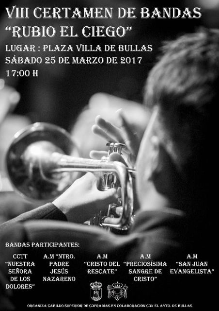 El sábado, 25 de marzo, a las 17 horas, tendrá lugar en la plaza Villa de Bullas el VIII Certamen de Bandas y Agrupaciones Musicales de Bullas 'Rubio el Ciego' que contará con: la Banda de Tambores y Cornetas Nuestra Señora de los Dolores, la Agrupación Musical Ntro. Padre Jesús Nazareno, la Agrupación Musical Cristo del Rescate, la Agrupación Musical Preciosísima Sangre de Cristo y la Agrupación Musical San Juan Evangelista. Organiza el Cabildo Superior de Cofradías con la colaboración del Ayuntamiento de Bullas.