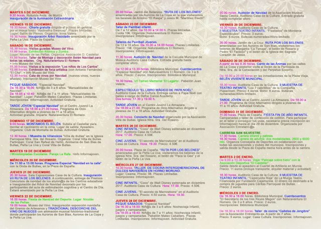 Dentro de nuestra programación especial navidad cabe destacar la II Muestra de Teatro Infantil, la VII Ruta de los Belenes, los diversábados especiales, tarde joven, carrera San Silvestres cuentacuentos, cine, talleres de cocina, canto de animas, apertura del vino de nueces, fiesta infantil de las campanadas y las uvas emulando a la noche vieja, entre otras muchas cosas más.