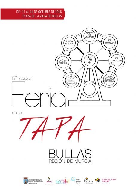 Sin apenas descanso, tras unas exitosas fiestas patronales, los vecinos de Bullas salen de nuevo a la calle para celebrar del 11 al 14 de octubre la edición número quince de la Feria de la Tapa que este año contará con la participación de los restaurantes: Cj Dos Punto Cero, Café Bar Mediodía, La Buena Estampa, Asador del Noroeste, Restaurante Borrego y Restaurante Castillico así como el stand del Consejo Regulador de la DOP Bullas que también estará presente.