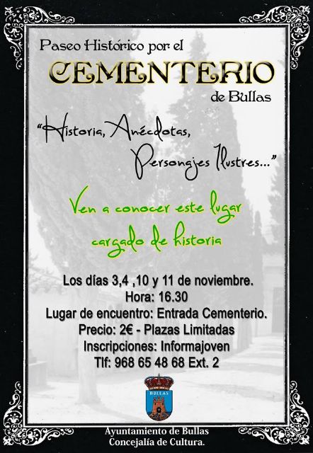 Se acerca el mes de Noviembre, y como es habitual en estas fechas uno año más se organizan desde la Concejalía de Cultura los ya tradicionales Paseos Históricos por el Cementerio de Bullas.