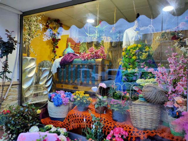 El escaparate ganador cuenta con arreglos florales, un cofre, motivos huertanos y el maniquí con la ropa de una huertana con un refajo hecho de flores.