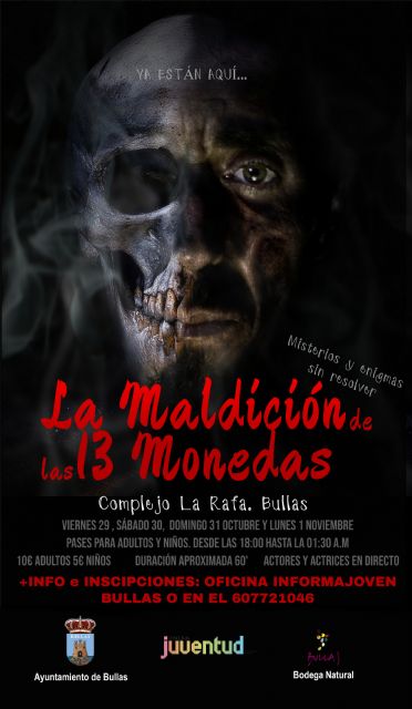 La concejalía de Juventud del Ayuntamiento de Bullas ha organizado para Halloween una actividad, que promete ser terrorífica a la par que divertida, llamada 'La maldición de las 13 monedas'.