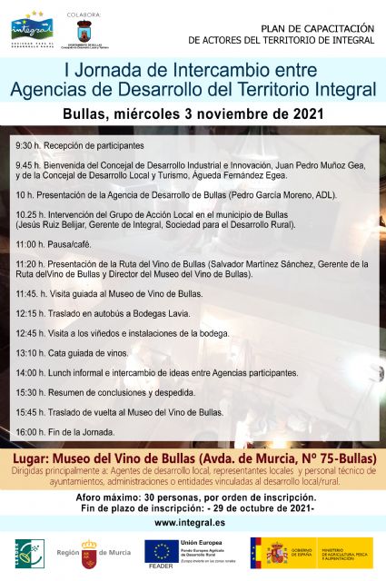 Organizado por INTEGRAL. Asociación para el Desarrollo Rural, en colaboración con el Ayuntamiento de Bullas, se va a realizar la "I Jornada de Intercambio entre Agencias de Desarrollo del Territorio Integral", dirigida a agentes de desarrollo local, representantes locales y personal técnico de ayuntamientos, administraciones o entidades vinculadas al desarrollo local/rural.