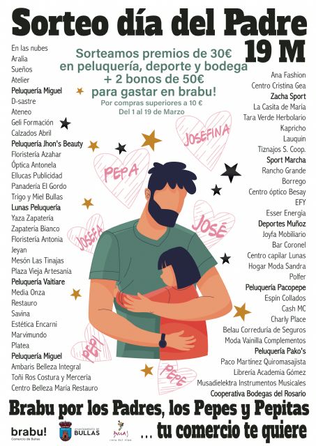 La Concejalía de Comercio del Ayuntamiento de Bullas, en colaboración con la Asociación de Comerciantes y Hosteleros de Bullas, ha hecho públicas las bases que regulan la nueva campaña de apoyo al comercio para el 19 Marzo, día del Padre. El lema es "Brabu por los padres, los Pepes y Pepitas…. tu comercio te quiere".