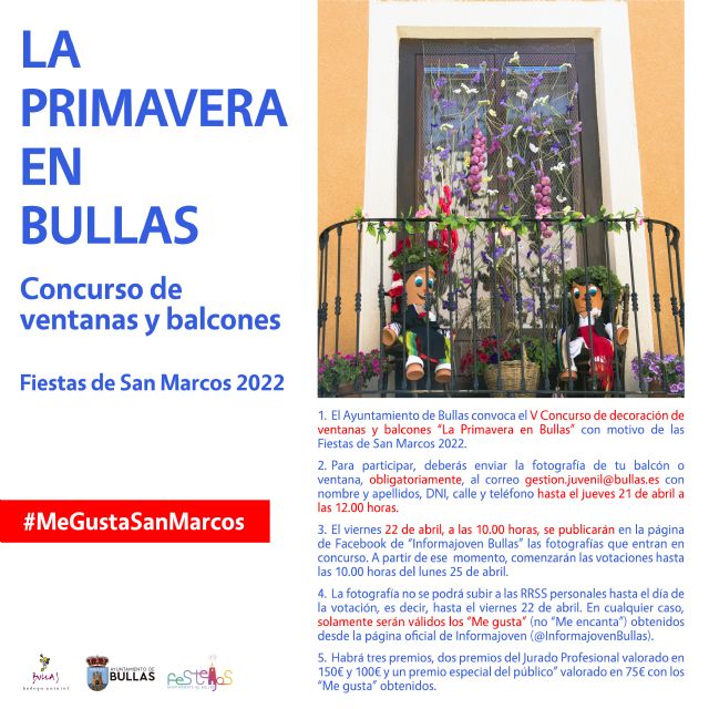 Para participar deberás enviar una fotografía de tu balcón o ventana a gestion.juvenil@bullas.es con nombre y apellidos, DNI y teléfono antes del jueves 21 de abril a las 12 horas.