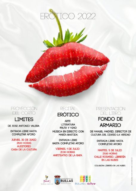 Por otro lado, el viernes día 1, tendremos el recital erótico en el que tendrá cabida el arte, la literatura, la fruta y el vino y música en directo con la guitarrista de música clásica y también de Bullas, María Bastida. Será a las 21.30 horas en el anfiteatro de 'la Rafa'.
