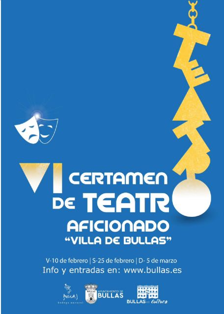 La Concejalía de Cultura del Ayuntamiento de Bullas presenta el VI Certamen de Teatro Aficionado 'Villa de Bullas' para los días 10 de febrero, 25 de febrero y 5 de marzo.