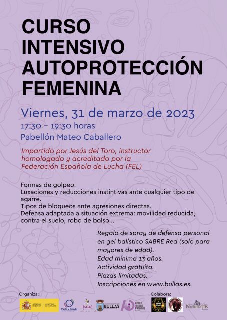 Finalizan las actividades programadas para conmemorar el Día Internacional de las Mujeres con un Curso Intensivo de Autoprotección Femenina, con el que se pretende enseñar a la población femenina técnicas de actuación ante cualquier situación que atente contra su integridad física. En este sentido se trabajarán formas de golpeo, luxaciones y reducciones instintivas ante cualquier tipo de agarre, tipos de bloqueos ante agresiones directas y defensa adaptada a la situación extrema, como movilidad reducida, robo de bolso, etc.