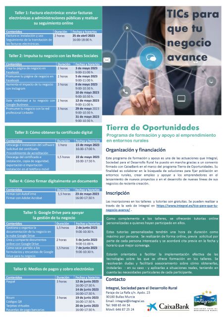 Las inscripciones en los talleres y tutorías se pueden realizar a través de la Web de Integral: https://www.integral.es/tics-para-que-tu-negocio-avance/ .
