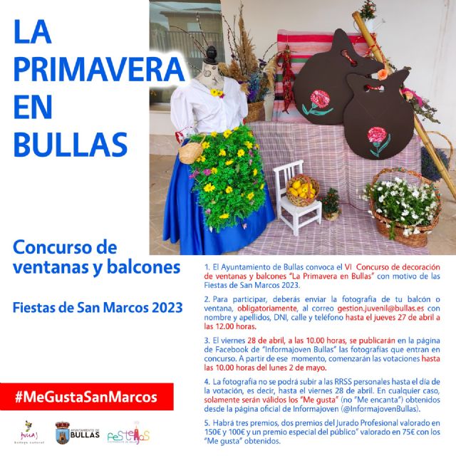 Para participar debes enviar una fotografía de tu balcón o ventana decorada con elementos que nos recuerden a la festividad o a la primavera, al correo de gestion.juvenil@bullas.es. Teniendo de plazo hasta el 27 de abril a las 12 horas.