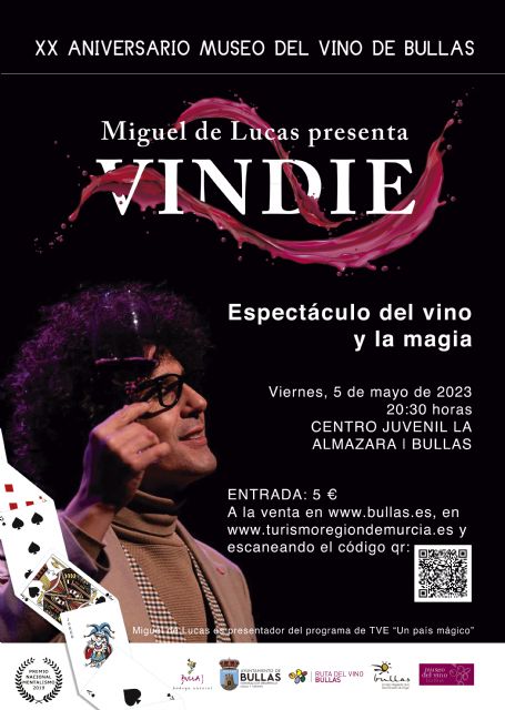 Vinos y naipes se unirán el próximo viernes 5 de mayo en el Centro Cultural La Almazara (frente al Museo del Vino de Bullas), en un espectáculo único, 'Vindie', en el que el ilusionista profesional Miguel de Lucas, presentador de "Un país mágico" en TVE, realizará un gran homenaje al proceso de elaboración del vino, al que considera un producto mágico, en el cual las barricas se convertirán en un gran imaginario del que nacerán racimos de uvas y botellas.