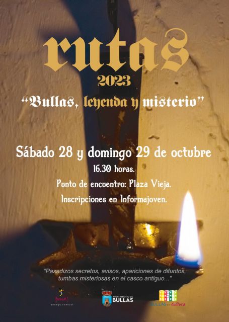 La Concejalía de Cultura del Ayuntamiento de Bullas informa que en el calendario de rutas guitadas por la localidad de Bullas, regresan las de 'Bullas, leyenda y misterio' para el sábado 28 y domingo 29 de octubre, fin de semana de Halloween o víspera de 'Todos los Santos'.