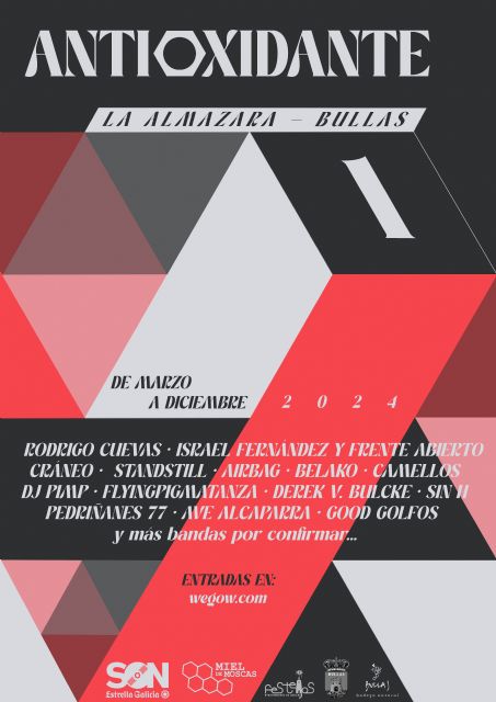 'Antioxidante' es el nuevo ciclo de conciertos que se celebrará, en su primera edición, entre marzo y diciembre de 2024 en el Centro Juvenil La Almazara de Bullas. Está organizado por Miel de Moscas, en colaboración con el Ayuntamiento de Bullas y SON Estrella Galicia.