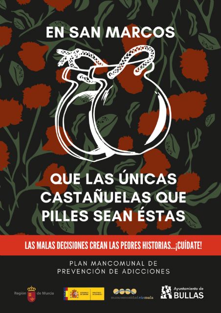 La Mancomunidad de Servicios Sociales, a través del Plan de Prevención de Adicciones, y junto con la Concejalía de Bienestar Social del Ayuntamiento de Bullas, promueve una serie de actuaciones dentro del ámbito comunitario, entre las que se encuentra la divulgación de cartelería para la prevención de consumo de tóxicos en menores durante la festividad de San Marcos.