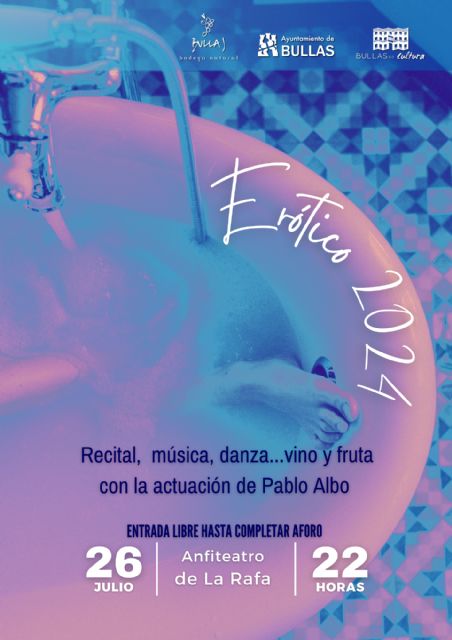 El próximo viernes, 26 de julio, Bullas celebra en el acogedor Anfiteatro de La Rafa el esperado 'Erótico 2024', un evento que combina recitales poéticos, música en vivo, danza y una exótica degustación de frutas y vinos de la DOP Bullas organizado por la Concejalía de Cultura del Ayuntamiento de Bullas y la colaboración de la Biblioteca Municipal.