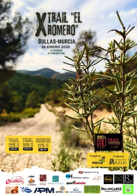 El Club Atlético Kinoa en colaboración con el Ayuntamiento de Bullas, organiza el X Trail del Romero, 3ª prueba del circuito Trail Tour FAMU 2025, desde las 9:00h. con salida y meta en la Calle Hospital