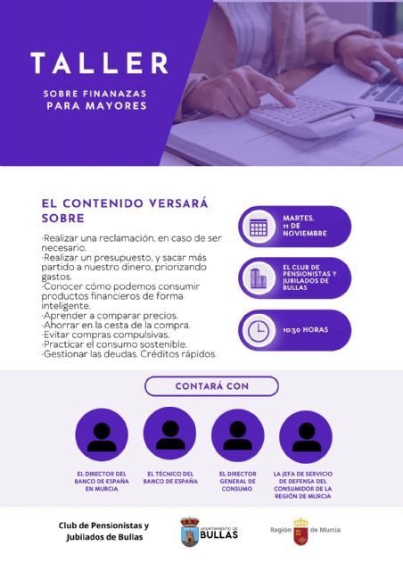 En Bullas, promovido por la concejalía de la Tercera Edad del Ayuntamiento de Bullas y el Club de Pensionistas y Jubilados, el taller se celebrará, el 11 de noviembre de 2025, a las 10:30 horas, en el propio club y abordará contenidos como cómo presentar una reclamación, elaboración de un presupuesto y gestión eficiente del dinero, consumo responsable de productos financieros, comparación de precios y ahorro en la cesta de la compra, prevención de compras compulsivas, prácticas de consumo sostenible, y gestión de deudas y créditos rápidos.