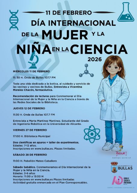 La primera de las actividades tendrá lugar el miércoles 11 de febrero, a las 11:30 horas, con la emisión en la radio municipal 'La Onda de Bullas' de una entrevista a Vicentina Morales Chacón, farmacéutica que ha dedicado su vida profesional al cuidado y al servicio de las vecinas y vecinos del municipio. Ese mismo día, desde la Biblioteca Municipal se realizarán recomendaciones de lecturas relacionadas con el papel de la mujer en la ciencia a través de sus redes sociales.